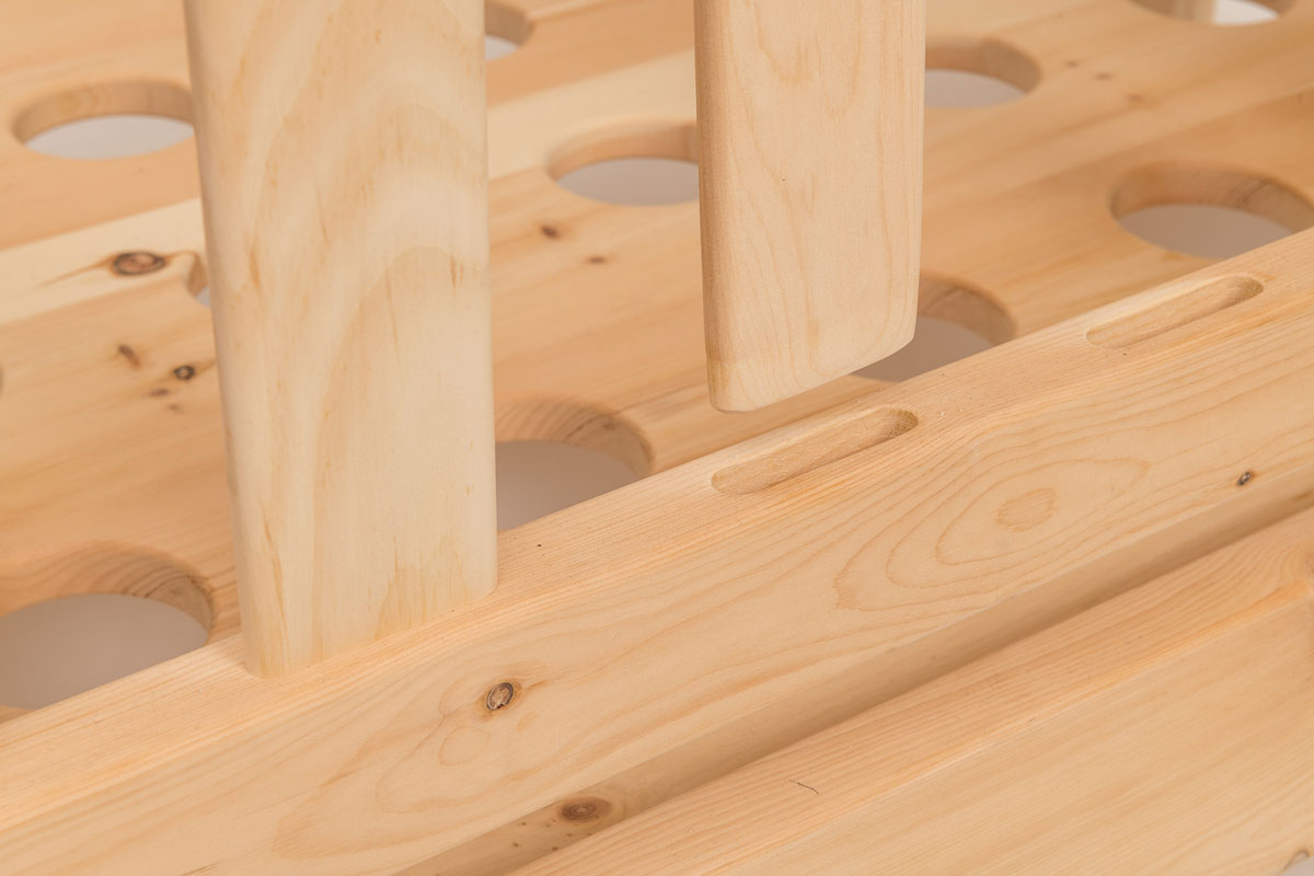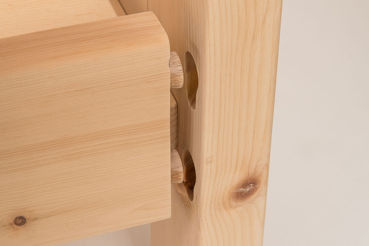 Wir verwenden als metallfreie Verbindung die bewährte Graddübelverbindung mit Hartholz. Diese ist äußerst einfach zum Zusammenstecken beim Aufbau und sehr robust – Sie benötigen überhaupt keine Hilfsmittel und mit etwas Übung steht ein Bett zu zweit in 3 Minuten.
